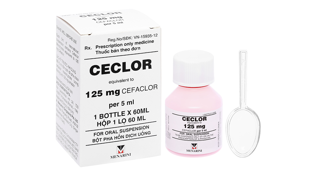 Ceclor của Công ty Menarini – Ý. Thuốc chứa Cefaclor, thuộc nhóm kháng sinh cephalosporin thế hệ 2, dùng để điều trị nhiễm khuẩn hô hấp, tiết niệu, da và mô mềm.
