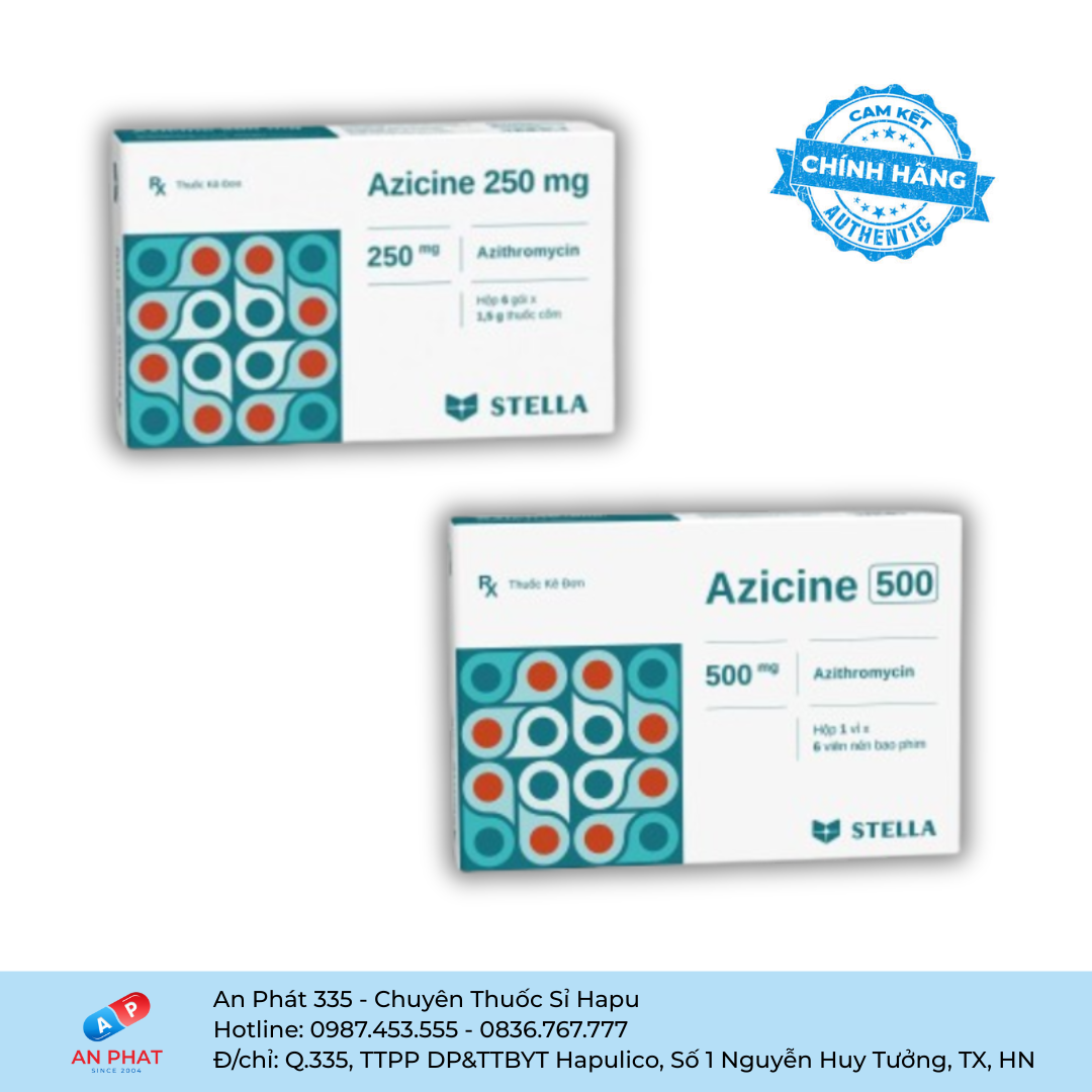 Azicine của Công ty Stellapharm – Việt Nam. Thuốc chứa thành phần chính là Azithromycin, thuộc nhóm kháng sinh macrolid, dùng để điều trị nhiễm khuẩn hô hấp, tiết niệu, da và mô mềm.