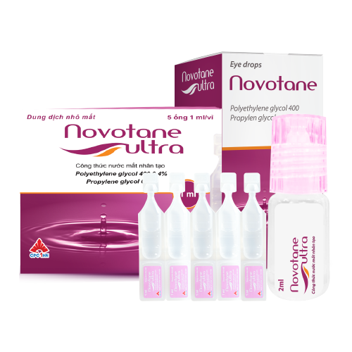 Novotane Ultra của Công ty CPC1 Hà Nội – Việt Nam. Thuốc chứa polyethylene glycol 400 và propylen glycol, thuộc nhóm thuốc điều trị khô mắt, dùng để làm giảm cảm giác khô rát, kích ứng mắt, bổ sung độ ẩm cho mắt.