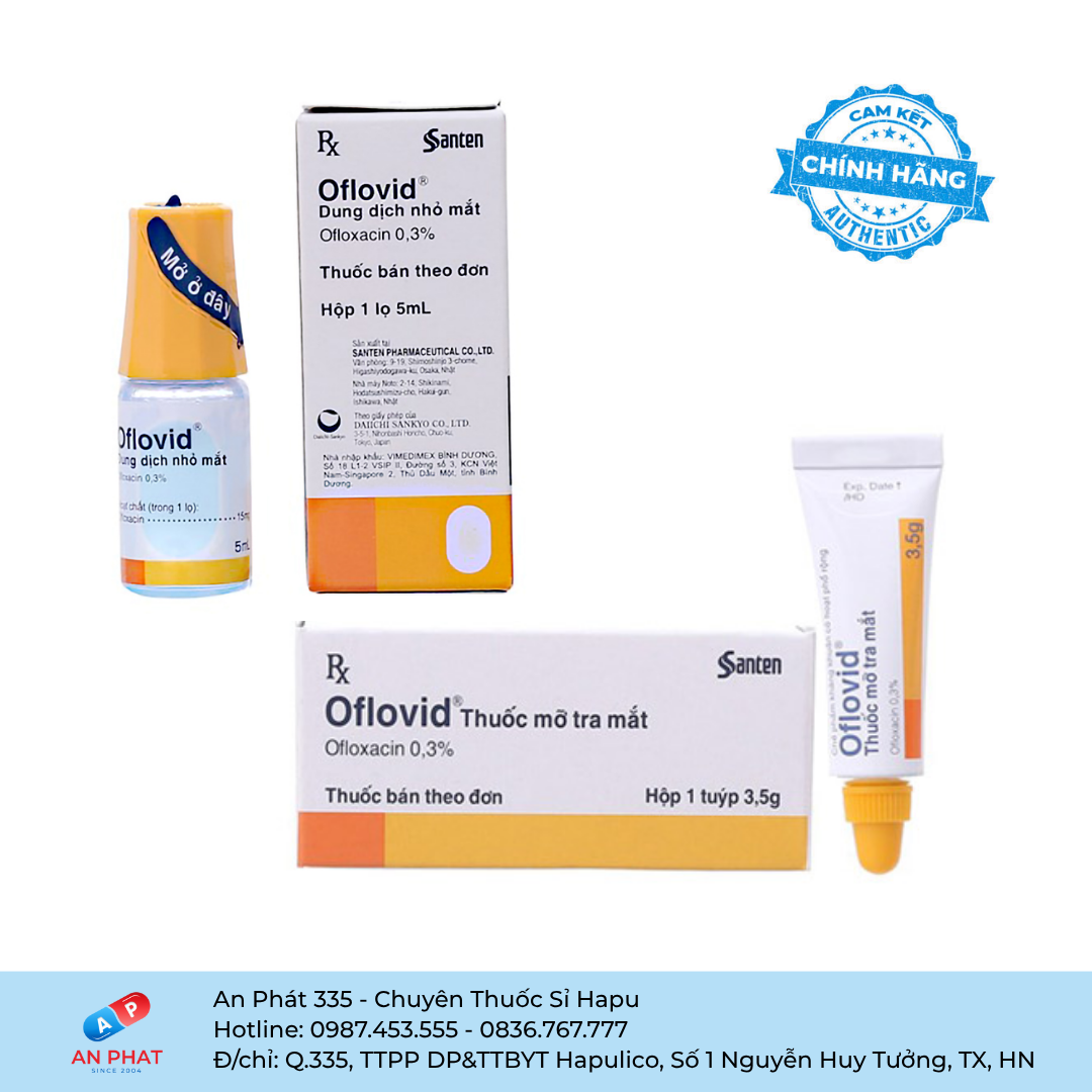 Oflovid và Oflovid ophthalmic ointment của Công ty Santen – Nhật Bản. Thuốc chứa ofloxacin, thuộc nhóm kháng sinh quinolon, dùng để điều trị nhiễm khuẩn mắt như viêm kết mạc, viêm giác mạc, viêm mí mắt, lẹo mắt.