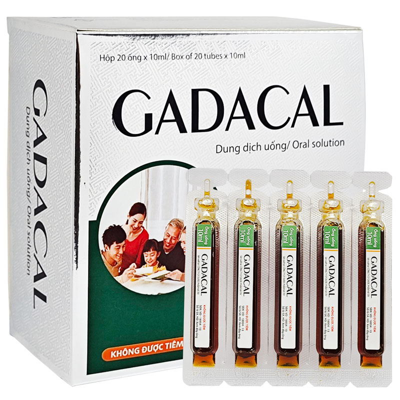 Gadacal của Công ty Cổ phần Dược phẩm Hà Tây – Việt Nam. Thuốc chứa Calci glycerophosphat, L-Lysin hydroclorid, các vitamin A, B1, B2, B6, C, D3, E, thuộc nhóm thuốc bổ sung khoáng chất và vitamin, dùng để bổ sung calci, phospho, acid amin và vitamin, hỗ trợ phát triển chiều cao, tăng cường sức khỏe, nâng cao sức đề kháng.
