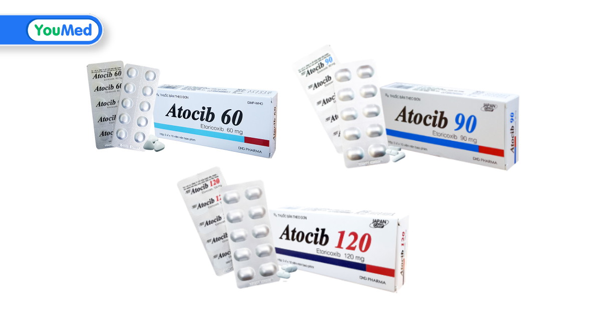 Atocib 90mg của Công ty Dược Hậu Giang – Việt Nam. Thuốc chứa thành phần chính là Etoricoxib 90mg, thuộc nhóm thuốc kháng viêm không steroid chọn lọc COX-2, dùng để điều trị viêm khớp, đau cấp tính, bệnh gút cấp.