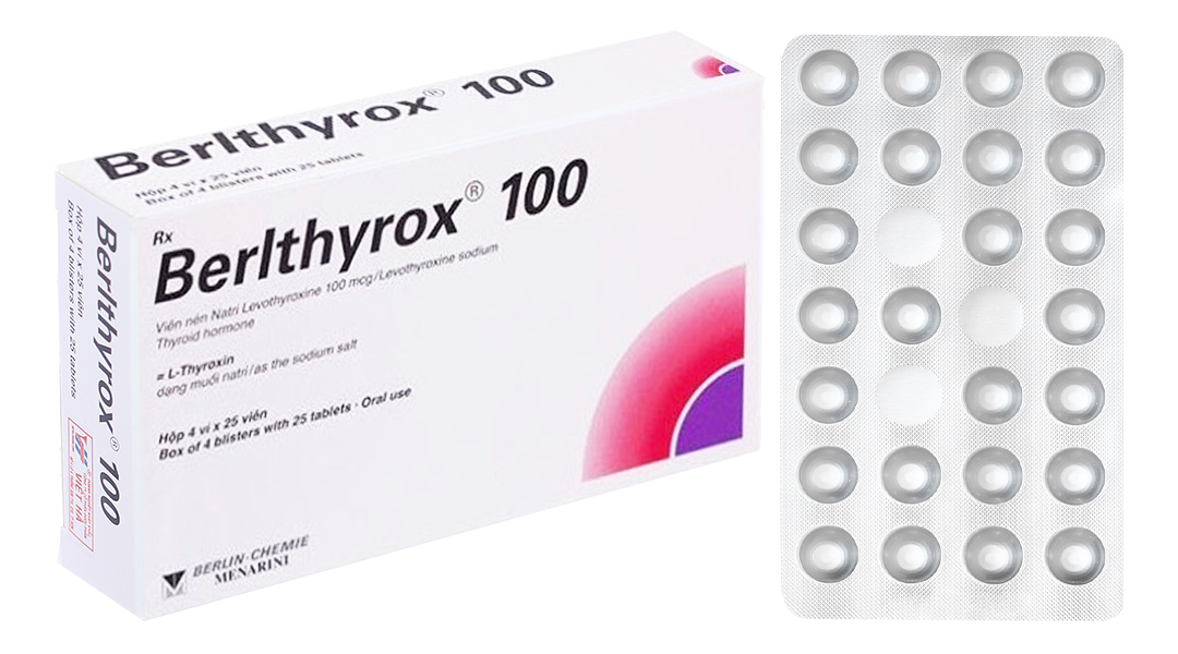 Berlthyrox 100 của Công ty Menarini – Đức. Thuốc chứa Levothyroxine sodium 100mcg, thuộc nhóm thuốc nội tiết, dùng để điều trị suy giáp, bướu giáp lành tính, phòng ngừa tái phát sau phẫu thuật bướu giáp.