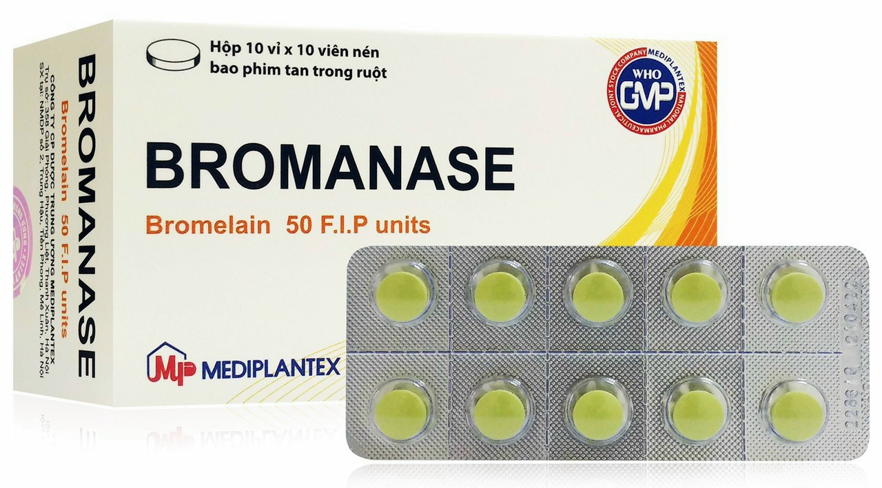 Bromanase của Công ty Mediplantex – Việt Nam. Thuốc chứa Bromelain, thuộc nhóm thuốc kháng viêm, tiêu sưng, dùng để giảm phù nề sau chấn thương, phẫu thuật, viêm xoang.