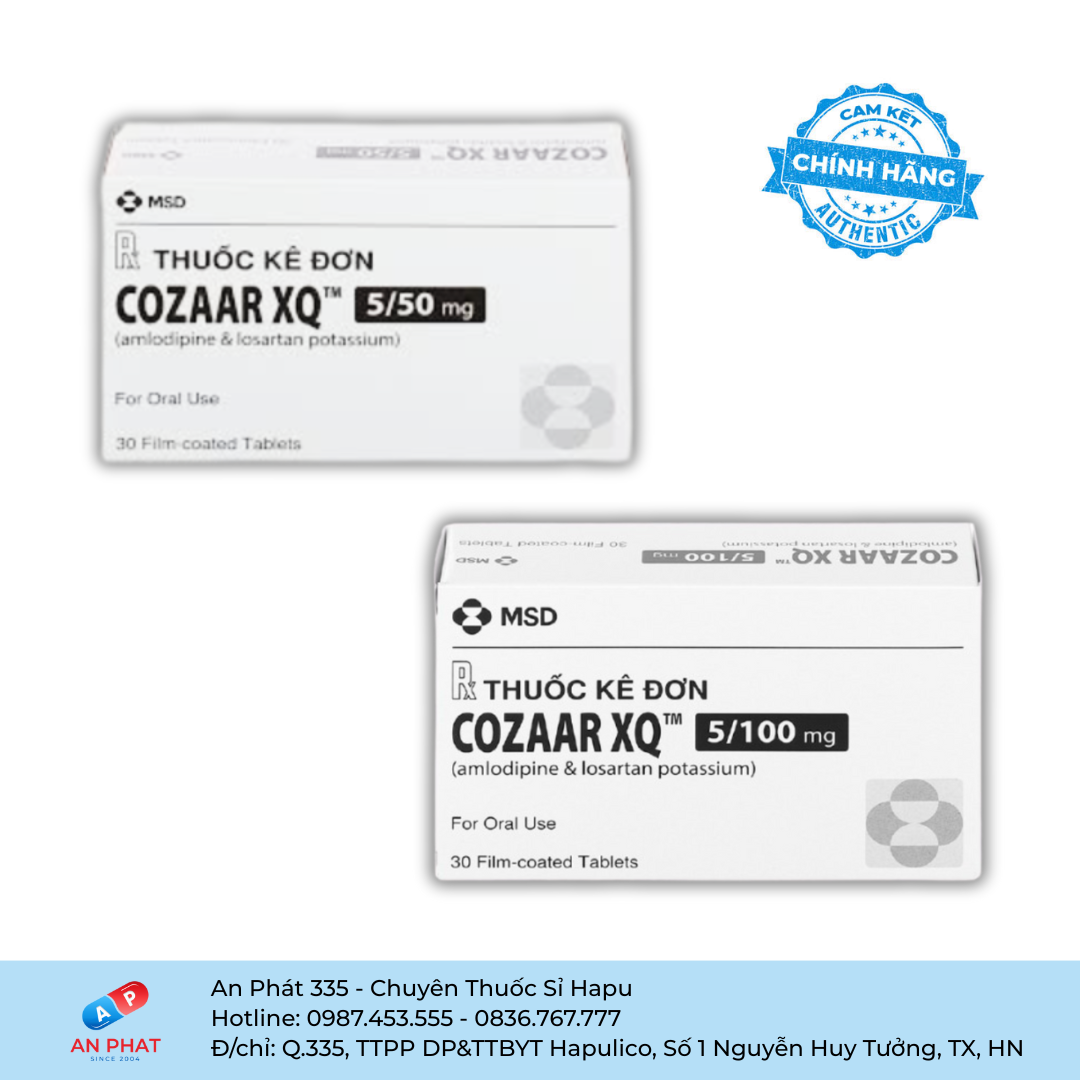 Cozaar XQ của Công ty MSD – Mỹ. Thuốc chứa Losartan potassium và Amlodipine, thuộc nhóm thuốc phối hợp điều trị tăng huyết áp, giúp bảo vệ thận ở bệnh nhân đái tháo đường typ 2 và điều trị bệnh động mạch vành.